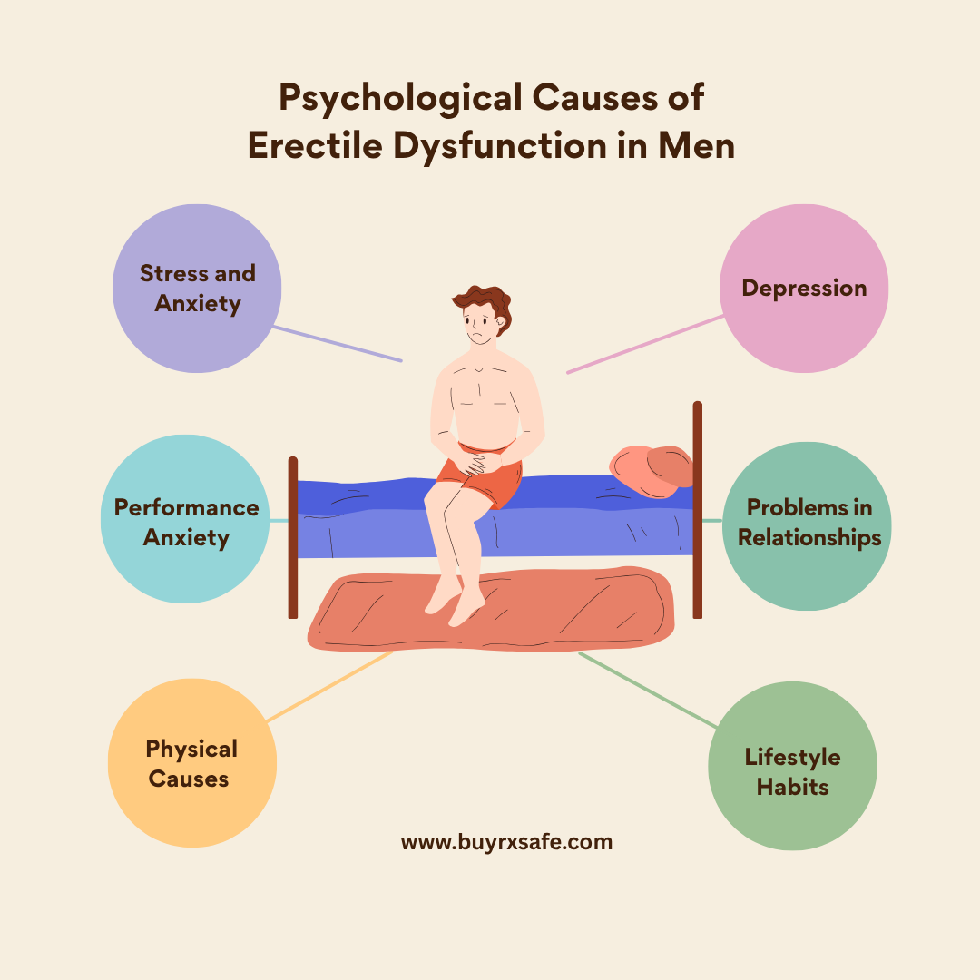 Erectile dysfunction (ED) disguises itself mainly in a combination of physical, psychological, and lifestyle causes. The physical factors comprise cardiovascular disorders, diabetes, hormonal disorders, and nerve damage, which affect the blood flow to the penis or nerves signaling to the penis. The sexual arousal and performance may also be interfered with by psychological factors such as stress, anxiety, and depression.
